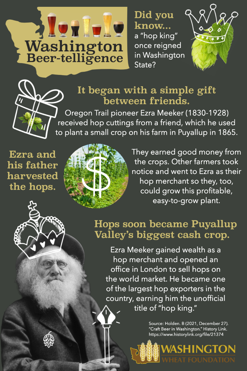Ezra Meeker, also known as the 'Hop King', planted hop cuttings on his farm in 1865 and soon became one of the largest hop exporters in the country. Cheers to the pioneers like Meeker who paved the way for Washington's thriving craft beer scene!